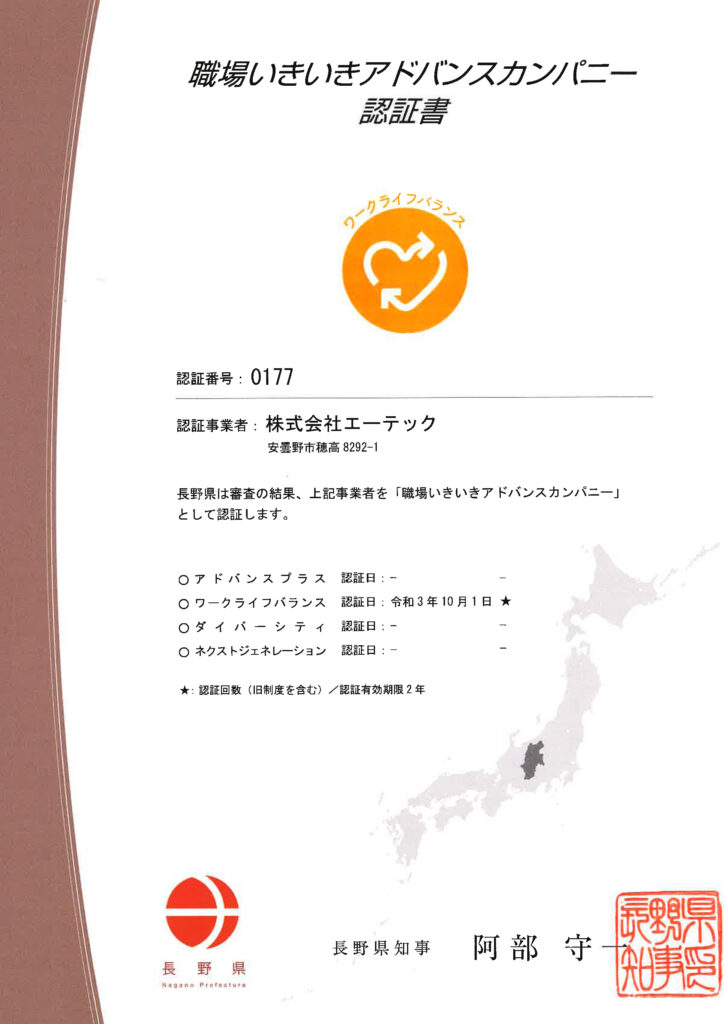 長野県では、誰もが活き活きと働くことができる職場環境づくりに先進的に取り組み、実践する企業等を「職場いきいきアドバンスカンパニー」として認証しています。